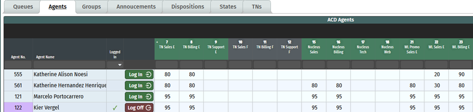 Agent No. – indicates the extension assigned to the agent upon set up. You will notice the extension of agents that are logged in to the queue are highlighted.