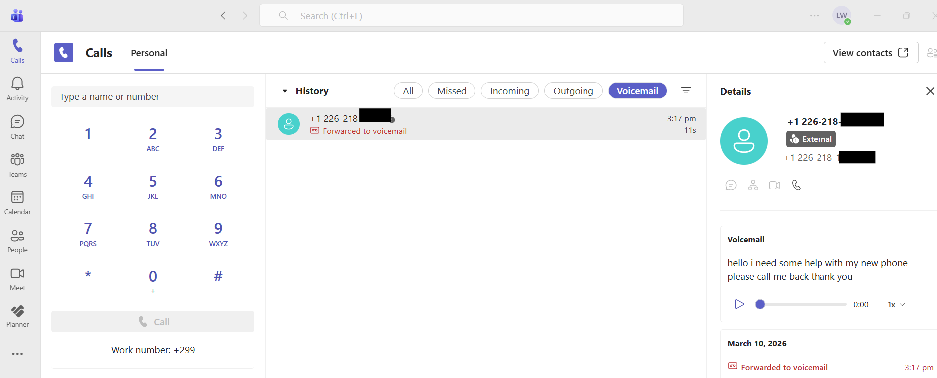 Voicemails will only be seen and retrievable in this pane if you opted to set up MS Teams voicemail. For set up information, please visit the MS TEAMS Call Settings Article. Note that the NEWT Business Phone system will be bypassed and voicemails will no longer be stored in NEWT's system.